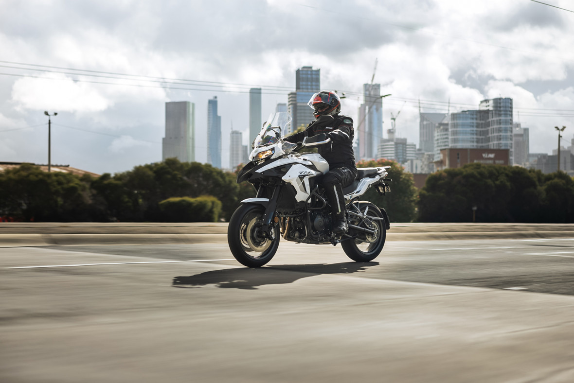 The TRK 502 is powered by an all-new and highly advanced 499cc twin-cylinder engine, 4-valve technology and double overhead camshfafts for maximum power, fuel injection for precise throttle response, and a six-speed gearbox.