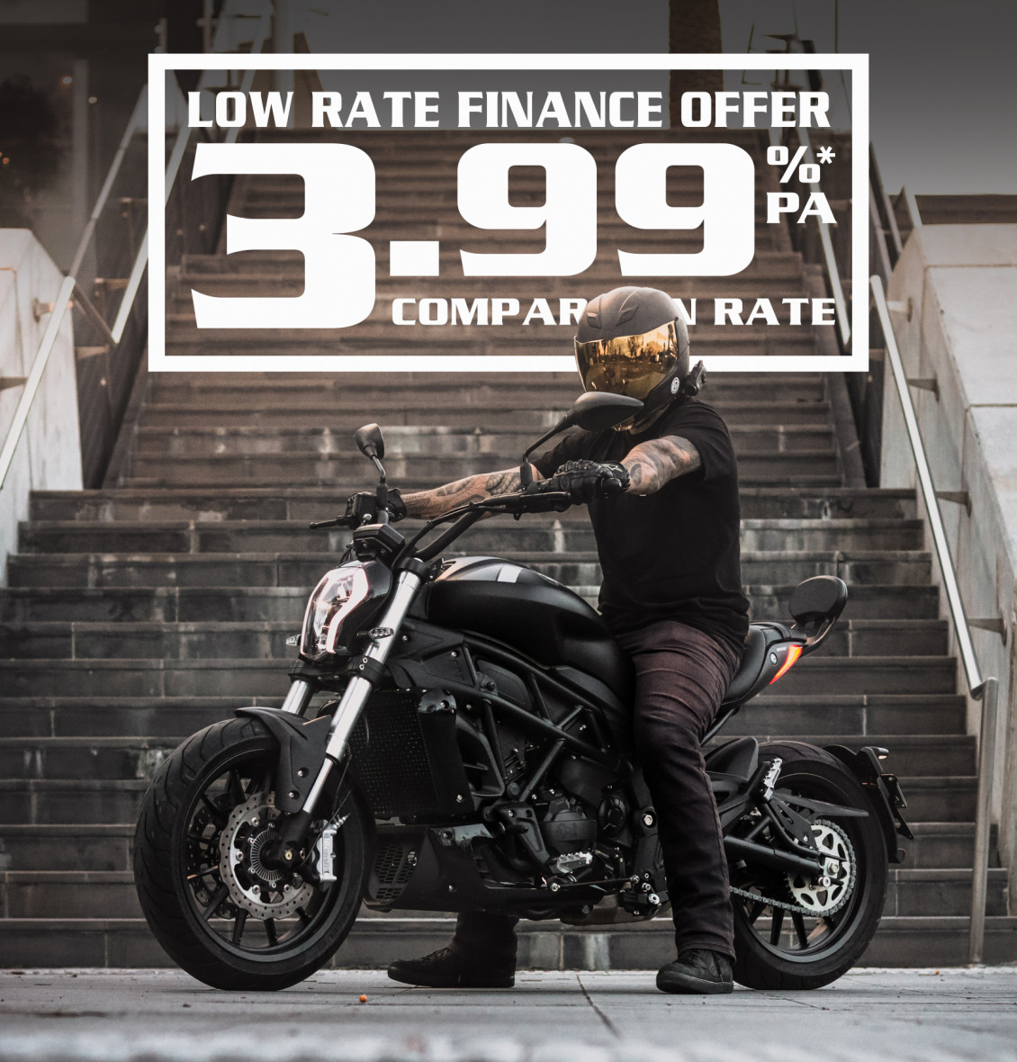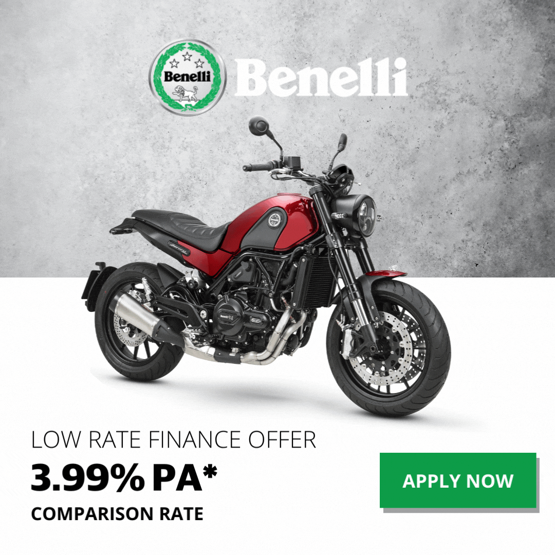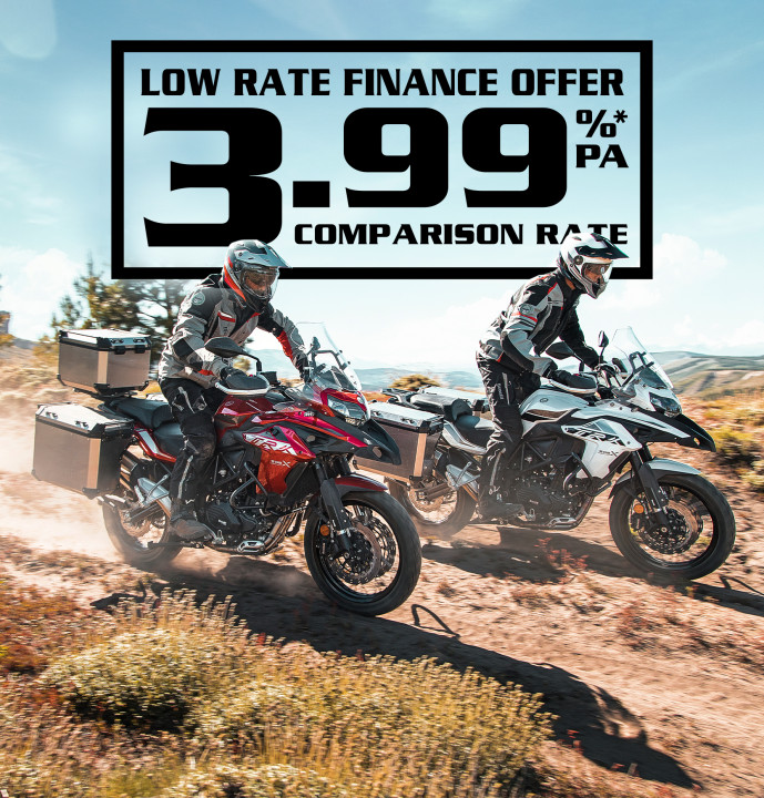 Finance for approved Australian customers only on a maximum loan term of 36 months. The interest rate quoted is applicable for new applications for the ‘Low Rate Product’ from 19th March 2022 and is subject to change without notice. The comparison rate is 3.99% pa calculated on the basis of secured credit of $10,000 over a 3-year term. WARNING: This comparison rate is true only for the examples given and may not include all fees and charges. Different terms, fees, or other loan amounts might result in a different comparison rate. The campaign is offered in Australia only, and not New Zealand. The campaign starts on the 19th March 2022 and ends on the 30th April 2022. Finance arranged by Urban Motor Finance Pty Ltd ACN 165 692 017, Australian Credit Licence 483180. All applications are subject to Urban Motor Finance’s normal credit assessment and loan suitability criteria. Terms, conditions, fees, and charges apply. A broker origination fee will apply. Offer available across the Benelli range on NEW 2021 and 2022 build models only. Applications must be approved and delivered before 29th April 2022 (stock must be available for delivery by this date).
