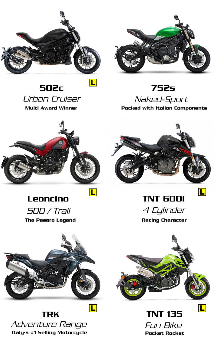 You can take advantage of our low 3.99% PA* comparison rate across the Benelli range, including the highest selling, and multi award-winning TRK 502 & 502x platform, 502c Urban Cruiser, 752s Sport-Naked, TNT 600i, TNT 135 Fun Bike, and the iconic Leoncino 500 Road & Trail models.